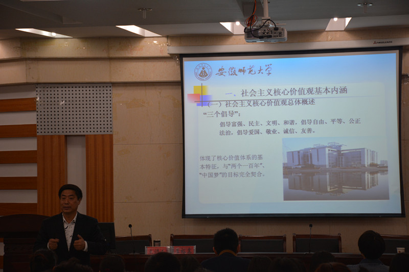 报告会上,李裕鑫首先介绍了党的代表大会中七次全会的基本工作方向和目标。随后,他介绍社会主义核心价值观的基本内涵,并向大家详细的解析了“三个倡导”,并从个人、社会、国家三个方面层以及“五位一体”下包含的经济、政治、文化、社会、生态来详细的解释“中国梦”。 随后,他详细的介绍了社会主义核心价值观的必要性的同时并且梳理了社会主义核心价值观与优秀传统文化的关系,从“仁爱”、“民本”、“诚信”、“正义”、“和合”、“大同”六个方面解释了优秀传统文化对社会主义核心价值观形成的影响以及优秀传统文化的底蕴和影响力。最后,李裕鑫结合习近平总书记在北京大学演讲时对青年大学生提出的“勤学、修德、明辨、笃实”要求,勉励同学们从严要求自己,从思想和行动上不断靠近党,为了党和国家的繁荣昌盛奋斗终身。李部长精彩的汇报赢得现在同学经久不息的掌声。