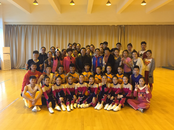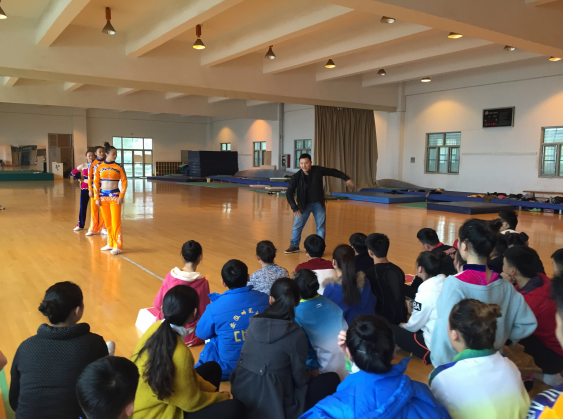在体育表演专业负责人陈建霞和其他健美操专项老师的陪同下, 唐红斌还前往我校北体育馆与学生进行了互动交流。交流会上, 唐红斌手把手地现场示范、指导了我院体育表演专业的学生, 如何克服躯干姿态单一化表达未能做到信息量最大化等问题。学生们 纷纷举手争取提问机会,现场气氛十分活跃。