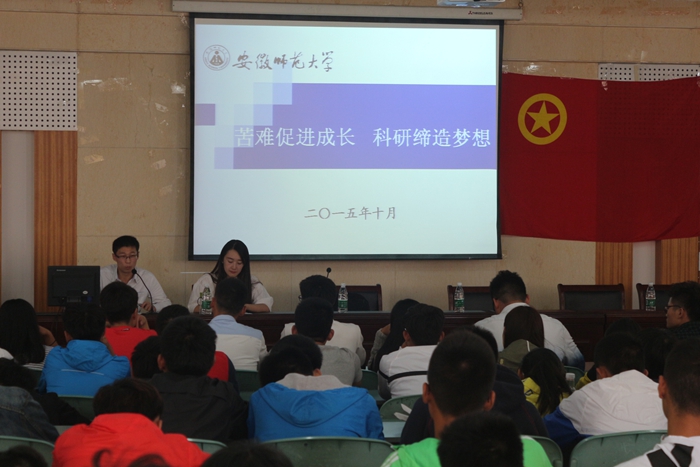 朱承节首先与同学们分享了他的成长故事,他结合自身经历,从跌宕人生、勤奋自强、科技创新、感恩社会这四个主题向大家分享。强调苦难促进成长,科研缔造梦想。李雅雯则与同学们分享了自己选择与规划专业发展的奋斗历程,回顾了在人生道路选择时刻的坚持、奋斗与善良,彰显了师大学子的青春魅力,使同学们受益匪浅。报告内容生动,现场气氛活跃,充满了催人奋进的青春正能量。