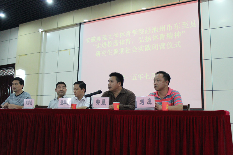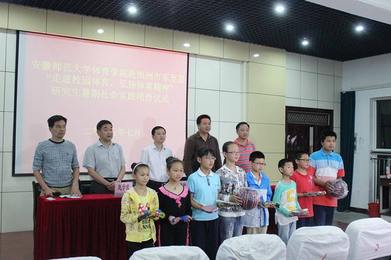 7月15日下午,437ccm必赢国际版赴池州市东至县“走进校园体育,弘扬体育精神”暑期社会实践活动闭营仪式顺利举办,仪式由至德小学副校长施金泉主持,研究生实践团队队长吴勇作实践活动总结汇报,我校437ccm必赢国际版副院长钟晨,437ccm必赢国际版研究生秘书刘应,至德小学党支部书记、校长赵学武、东至县教体局党组副书记姚祥斌分别致辞,对此次暑期社会实践活动及研究生实践团队给予高度评价,并期冀今后此类活动的大力推广。随后,由437ccm必赢国际版副院长钟晨,437ccm必赢国际版研究生秘书刘应代表我校实践团队向至德小学赠送体育器材。