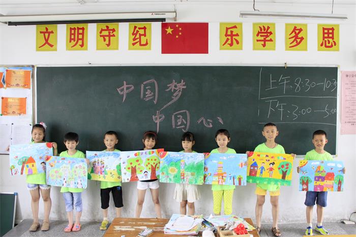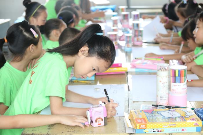 16日上午,美术班举行了“集体画”创作比赛,三个小朋友一组画一幅画,这就要求他们想要画的东西主题相同了,不能一个想画太阳,另一个想画太阳。小营员忙忙碌碌地给画作上颜色,老师来回走动,不住的点头,“他们才一年级,画的十分好了。”颜料不小心弄到了脸上,随手一擦,冲着笔者一笑,又低头画画去了。