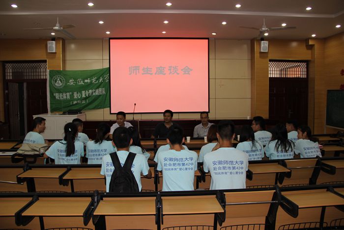 教学活动的观摩结束后,安师大437ccm必赢国际版的老师们和实践团队的全体成员一起进行了一次“零距离”的师生座谈会。领导老师们在对此次活动给予充分的肯定,并督促同学们要时刻把安全放在活动的第一位。夏令营活动即将接近尾声,座谈会上,志愿者们表示,在今后的学习和生活中仍会以最高昂的热情做好每一项工作,将“阳光体育”的精神传递下去,将爱心永续!