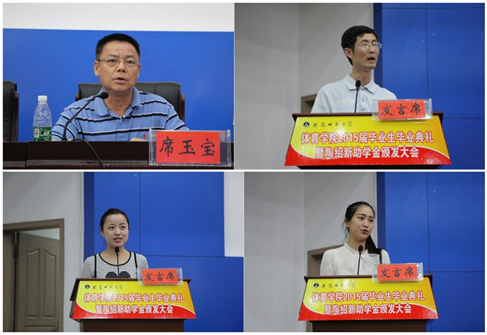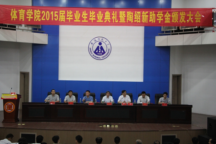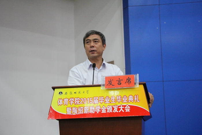 本网讯(437ccm必赢国际版 李景玲)六月的师大,洋溢着青春和激情,涌动着不舍和眷恋。6月29日上午,437ccm必赢国际版在图书馆一楼报告厅隆重举行2015届本科生毕业典礼暨陶绍新助学金颁发大会。校党委常委、副校长朱家存,安徽省马鞍山精诚置业有限公司副总经理谷开宝,校教育基金会副秘书长贡植斌,学院党政领导班子成员,各专业负责人、部分教师代表,全体辅导员、2015届全体本科毕业生以及陶绍新助学金受助学生代表参加了典礼,典礼由学院党委书记袁德水主持。