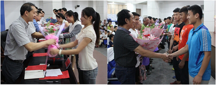 毕业典礼在雄壮激昂的国歌声中拉开序幕。席玉宝代表学院致辞,他向2015届毕业生顺利毕业表示热烈的祝贺,希望同学们在未来的人生中能够坚定信念、志存高远;积极进取、勇于挑战;心系母院、学会感恩。宣海德老师代表任课教师为毕业生寄语,非毕业班学生代表方萍、毕业班学生代表李梦莹分别发言。随后,毕业生代表向与会老师献花,一束束美丽的鲜花传达了深深的感激之情。
