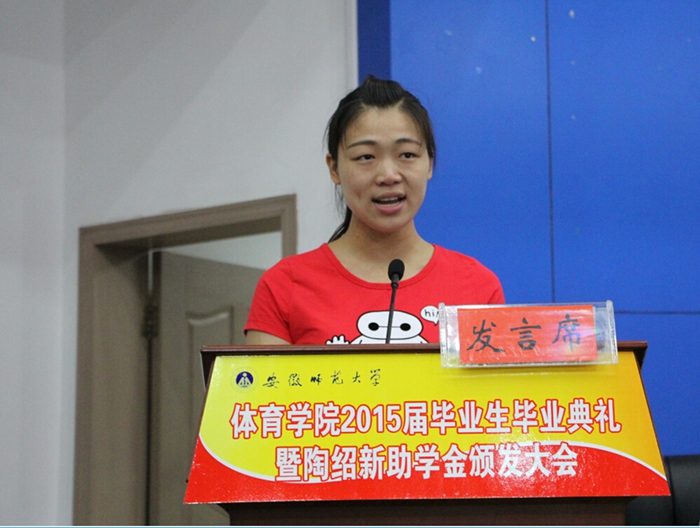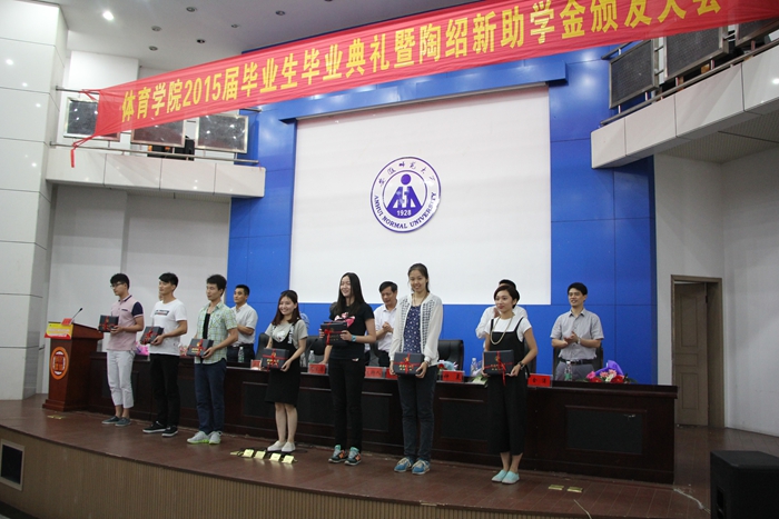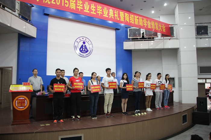 毕业典礼结束后,学院举办了第三届陶绍新助学金颁发大会,院党委副书记黄德春宣读《关于向杨冬等25名同学颁发第三届陶绍新助学金的决定》,接着,受助学生代表王梦婷代表全体受助学生向陶绍新先生表达了深深谢意,并表示将会继续努力学习,在日后的学习生活中一定会用自己的成绩来回报学校和社会的关爱。最后,马鞍山精诚置业有限公司副总经理谷开宝向受助学生代表颁发陶绍新助学金,激励同学们要好好学习,抱着感恩的心将来回报母校,并将感恩之心继续传承下去。