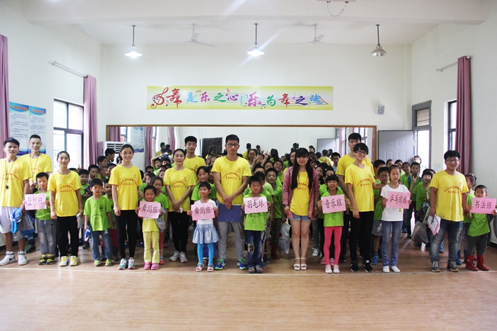 早晨七点半,下起了小雨,志愿者们站在校园门口迎接学生和家长的到来。一百多名小学生陆续到来,校园里充满了孩子们的欢笑声。志愿者们组织学生在舞蹈房集合,开始为学生们发放绿色队服。帮助孩子们穿好队服后,七个特色班级的负责老师依次上台展示各自才艺,舞蹈老师现场跳起了拉丁、武术老师打起了行神拳……各自以独特的方式吸引孩子加入自己的团队。一切准备就绪后志愿者老师们带着各自班级的孩子排着整齐的队伍前往参加夏令营开营仪式。