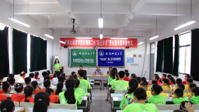 本网讯(437ccm必赢国际版团委)又是一年七月,又是一年相聚,bwin必赢线路检测阳光体育夏令营爱心支教团队第三次走进黄山休宁海阳二小。2015年7月14日上午9时整,夏令营开营仪式在多媒体教室拉开了帷幕。与会人员有休宁县县团委副书记方程、休宁县教育局教研室体育教研员胡志宏、休宁县海阳二小副校长程强武、阳光体育爱心夏令营的全体志愿者和小营员。