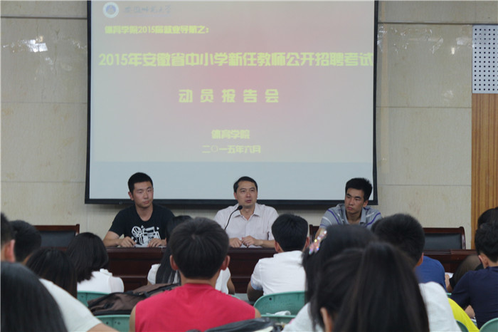 本网讯(437ccm必赢国际版 文/吴晓旭 摄/刘毅文) 为做好我院2015年度安徽省中小学新任教师公开招聘工作,帮助广大毕业生全面了解考试动态,明确复习方向。6月11日,437ccm必赢国际版在圆形报告厅举行专题动员报告会。院党委副书记黄德春、12级辅导员蔡维敏,拟报考此次公开招聘考试的毕业生和部分2012级学生80余人参加了报告会。会议由2011级辅导员徐梦涛主持。