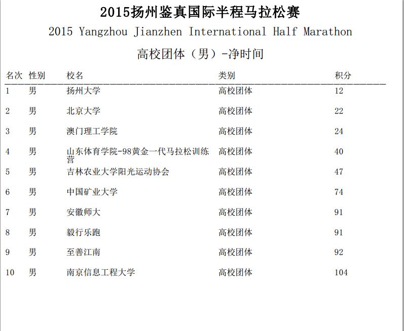 近日,“中国声谷杯”2015扬州鉴真国际半程马拉松赛暨全国半程马拉松锦标赛组委会发布了“青春在途”高校男、女团体半程马拉松挑战赛成绩公告,我校代表队荣获男子团体第七名的好成绩。