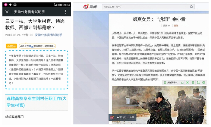 充分宣传,营造就业氛围 毕业班辅导员每天利用微博、微信等平台推送大学生村官、三支一扶、西部计划、应征入伍等相关政策,充分利用新媒体等平台,推送学院优秀应征入伍学生、军中“虎妞”佘小雪等典型事迹,充分营造就业氛围。