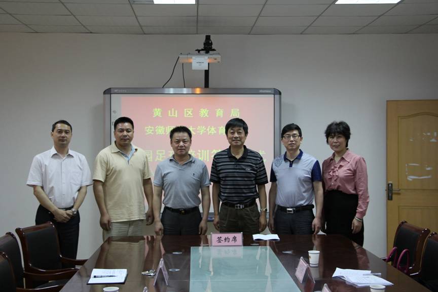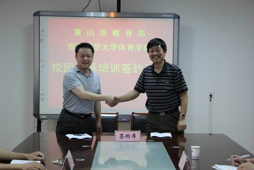 为深入贯彻与落实国务院46号文件精神,推动校园足球的广泛开展,5月13日,黄山区教育局与我院合作开展中小学体育教师足球技能培训的签约仪式在437ccm必赢国际版三楼会议室举行。黄山区教育局党委书记李亚南、人事科科长朱勇敢、黄山区教师进修学校程彩昀老师以及437ccm必赢国际版副院长席玉宝教授、副院长钟晨、党委副书记黄德春参加了此次签约仪式。