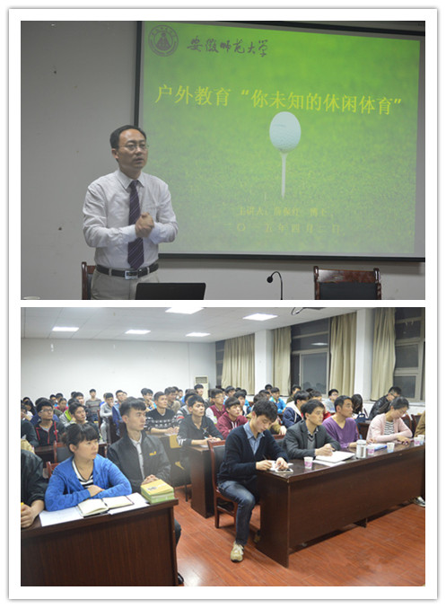 学术讲座,学院促进理论教育。任何教育都离不开理论教学,在学院支持下,邀请薛保红到我院为休闲体育的同学们做了一次学术报告,让同学们了解到什么是体验式教育。讲座中,薛保红首先以一个游戏开始,结合自身的学习工作经验,深入浅出的向在场的师生们介绍了休闲体育健康、文化产业的发展,结合六个名词即“教育、体育、户外、休闲、户外教育、休闲体育”并且向大家全面的解释了各个名词的含义以及结合这些名词对自己未来发展的意义。接着,他结合自身的成功的学习经验,用视频来向大家展示各种各样的休闲体育活动,帮助同学们认识休闲体育,从中学习到更多的理论知识。最后结合休闲体育的专业特色向同学们介绍不同的职业定位,给予同学们“理论与实践相结合、传统与时尚相结合、校内与企业单位同步推进、素质提升与证书考取相结合、投入与收获成正比、冒险与机遇并存。”六点建议,同时邀请同学们可以参加他组织的体验教育活动,为未来的发展做出铺垫。