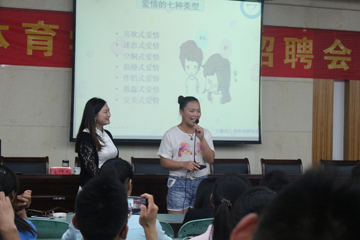 讲座上,王文君首先用一首优美的音乐让同学们心情放松,接着,她结合三毛的一句话并用自己和周围其他人的真实事例来向大家阐述什么是爱情。其次,她用爱情三角理论和爱情的七种类型向同学们进一步的解释了在恋爱中男女生思想发生的变化,同时给予了同学们许多关于爱情方面的建议和方法,让同学们清楚的认识到自己恋爱的哪些方面还存在问题,帮助同学们更好地解决问题。随后,王文君与班级同学展开互动,邀请同学们说出自己在恋爱观上面的认识以及与恋人相处时的方式方法,并对同学们的疑惑给予解答,赢得了现场同学们热烈掌声。