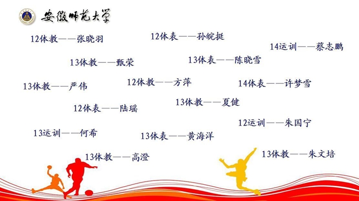 比赛中,从预赛中脱颖而出的15位参赛同学各展风采,他们用优异的学习成绩、端正的思想态度、突出的专业荣誉和丰富的实践经验向在场的各位评委和同学们展现了作为一名体育人的骄傲。最终,经过紧张激烈的角逐,12级体育教育的方萍、12级体育教育的张晓羽以及13级体育表演的黄海洋获得了本次活动的一等奖。