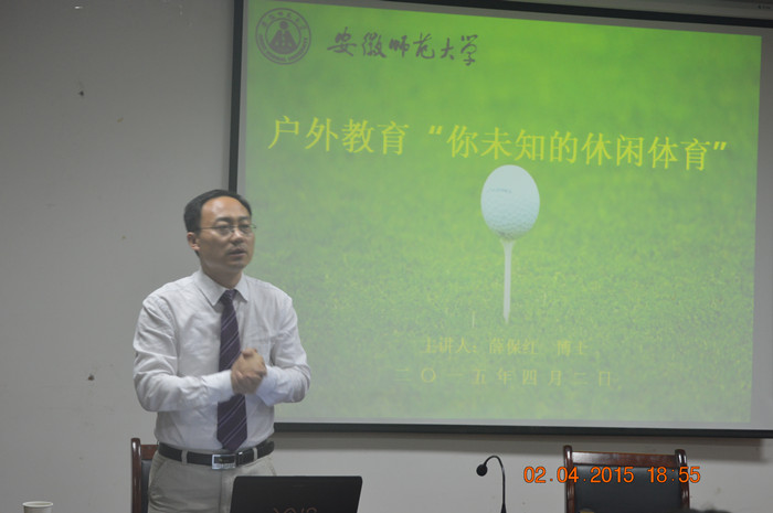 本网讯(437ccm必赢国际版 黄彦锴 唐增阳)4月2日晚,在我院行政楼二楼,国内体验教育权威专家、安徽工程大学体验教育研究中心主任薛保红博士,为我院师生作了主题为《户外教育“你未知的休闲体育”》的学术讲座。副院长金涛、社会体育专业负责人宣海德、相关专业教师以及辅导员黄彦锴出席讲座,2014级休闲体育专业全体同学聆听了讲座。讲座由金涛主持。