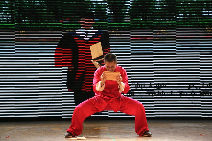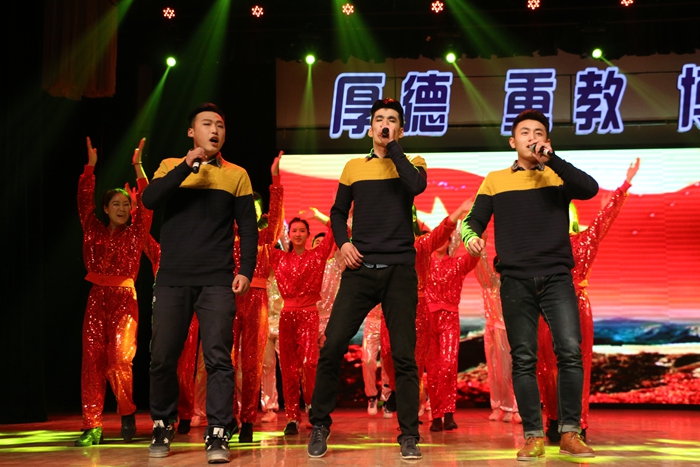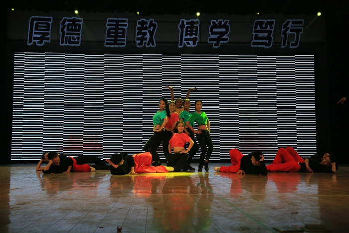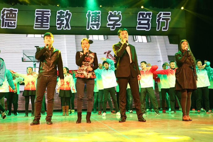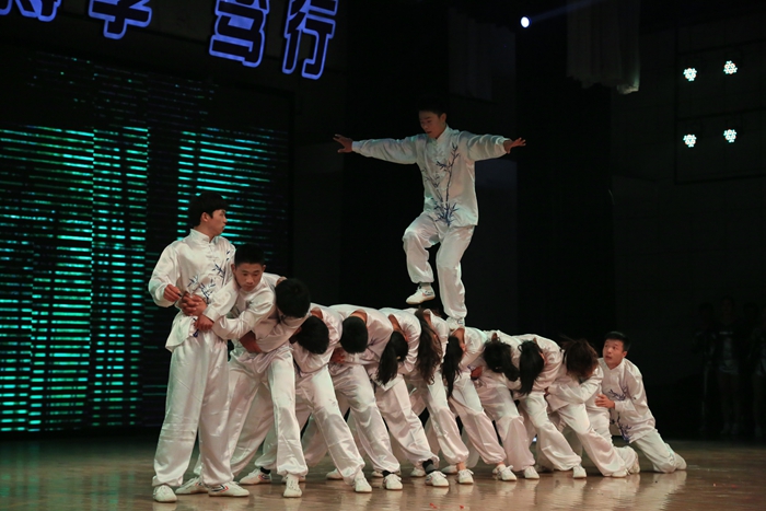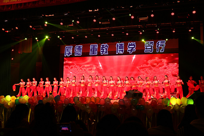 晚会在热情洋溢的舞蹈《开门红》中拉开帷幕,优美的舞姿搭上喜气的音乐,让在场的所有观众感受到新年的欢乐,随后健美操舞蹈《红舞中国》,舞出希望、舞出对祖国的爱;情景剧《发财梦》天马行空而又怪诞不羁的梦境,生动形象的表现出我院大学生青春活力以及昂扬向上的精神风貌;教师节目爵士舞《jazz and modern dance》性感的舞姿、动感的音乐,彰显体院老师的活力和热情。一曲《你的眼神》拨动了在场所有观众的心,歌声婉转优雅,赢得了满堂的欢呼声;武术表演《武殇》激情豪迈,气势磅礴;健美操《舞动青春》轻盈的身姿,矫健的步子和动感的音构,构成了一支流光溢彩的青春舞曲;舞蹈《墨魂》带领观众梦回徽州,体验力量与艺术、古典与现代的完美结合;教师吴本连带来的特技《少林金刚》展示了吴老师扎实的硬气功功底;乐器演奏《美丽的神话》让我们品味岁月沉淀的酒,追寻美好的未来。小品《月光宝盒之奋斗的青春最美丽》用幽默轻松的语言诠释了大学生活的美好;歌曲《大中国》唱出了我们对祖国母亲的热爱之情;研究生节目戏剧《国粹》引爆全场,变脸绝活出神入化;舞蹈串烧《冠军的摇篮》作为校新生才艺大赛金奖获得者再次登上舞台,为观众带来激情四射的表演;青春活力的赞歌拉丁《卫神》演绎出了悠扬的青春歌声、展示了美丽的青春画卷;技巧啦啦操《I’m tiger》由连续三届获得全国冠军的我校“only one”啦啦队演绎,高难度的技术动作、活力四射的音乐让观众目不暇接;最后,两位2014级新生辅导员带领新同学们演唱曲目《相亲相爱》,为整场晚会拉下帷幕。