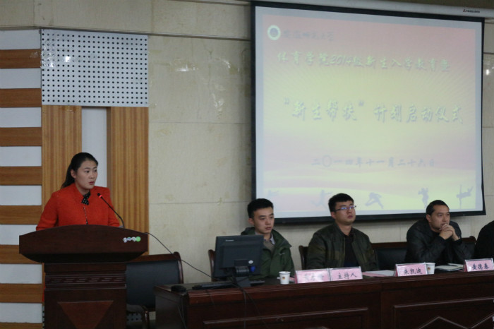 仪式上,李景玲宣读《437ccm必赢国际版2014级新生入学教育方案》,介绍了2014级新生入学教育系列活动的详细内容;朱凯迪宣读《437ccm必赢国际版“新生帮扶”计划实施方案》,具体介绍了学院“新生帮扶计划”实施办法;汪暠为新生详细解读了《437ccm必赢国际版宿舍管理暂行办法》。2012级体育教育专业朱克席与新生们分享了自己的成长经历和大学的新生活、新习惯、新学习方式,并且鼓励同学树立理想、加强学习、参加实践,在实践和学习中找到自己的努力方向。