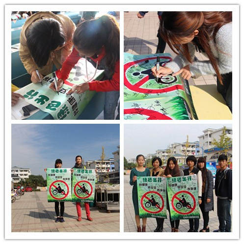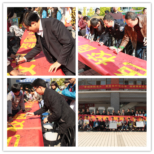 安全出行记心中,校园禁摩在行动。11月13日中午,为固化活动成果,437ccm必赢国际版团委在二食堂门口开展横幅签名征集活动,倡议全校学生自觉禁车禁摩,做到绿色出行,安全出行。校学工处处长台启权、校保卫处处长孙成岗、校团委副书记刘长生,院党委副书记黄德春以及学院全体专兼职辅导员同时到场指导并签名倡议安全绿色的出行方式,大家都系上了象征绿色环保的绿丝带。签字活动得到了全校同学的积极响应,大家纷纷在“安全出行、绿色出行,禁摩从我做起”的横幅上签下了自己的姓名和祝福。