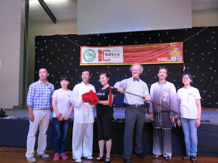 牛芳、王国凡于9月22日抵达达尔文大学,在该校7天的交流教学活动中,两位教授分别对孔子学院的学生进行了民族舞蹈、武术的教学指导及庆典表演活动的彩排指导。在27日的“孔子学院日”庆典活动中,两位教授还登台表演了中国民族舞蹈和中国功夫,受到了大会来宾的一致好评。表演结束后,两位教授还将自己随身带来宝剑和中国扇赠送给了孔子学院,增进了两校之间的友谊。