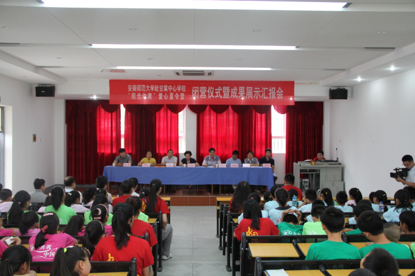在结束了精彩的表演之后,“阳光体育”爱心夏令营的闭营仪式随后在庄严的国歌声中拉来了帷幕。此次闭营仪式由甘棠中心学校校长章炎林主持,志愿者代表以及营员代表依次发言,437ccm必赢国际版以及黄山区当地领导作总结性讲话。实践团队队长鲍垚作为志愿服务者代表首先发言,他对本次暑期社会实践做了深刻的总结,并代表暑期社会实践团队对黄山区政府以及甘棠中心学校等的大力支持表示感谢。随后,小营员代表也跟大家分享了自己在夏令营的小故事,表达了对老师们十天无私奉献辛苦教学的感谢,也对老师们即将离去表达了万分不舍。接下来,黄山区副区长曹恒凤首先对安师大437ccm必赢国际版学生的到来表示热忱的欢迎,对老师们无私奉献的精神表示感谢。与此同时,437ccm必赢国际版党委书记袁德水对于大学生暑期社会实践提出了三点希望。第一,他希望学生们能够认真总结不断进步,将专业知识同社会实践相结合,真抓实干,树立正确的世界观人生观价值观。第二,学生们应该不断创新机制,创造出新的领域,为暑期社会实践注入新的血液和能量。第三,他希望学生们能够勤奋学习,扎实学好专业知识。在最后的结尾中,袁德水表示,希望安师大能够出现更多的来自黄山区的孩子,同时也预祝黄山区暑期社会实践团队取得成绩。仪式的最后,甘棠镇中心学校与安师大437ccm必赢国际版互赠礼品和锦旗,以表达双方对于此次活动的支持和感谢,也因此打成了良好的合作态势。