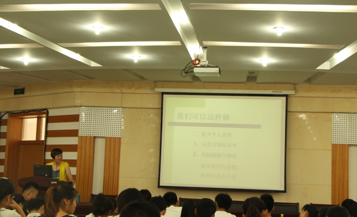 培训会开始后,宋玲首先从中小学生注意力不集中、理解能力弱、易受外界干扰的心理特征入手,运用自己从事多年班主任的经验向大家讲述了小学生参加体育活动时的心理特点。接着,宋玲指出我们在开展“阳光体育”爱心夏令营的时候要注重对学生的兴趣培养,做到“寓教于乐,寓练于趣”,她建议大家在教学时内容要多样化,教学形式要游戏化,注重鼓励式教育。最后,宋玲告诉大家要提升个人素养,真正起到示范引领的作用,并且她也表达了对于大家的期待,鼓励大家感受成功与喜悦,做到体育活动人人爱。