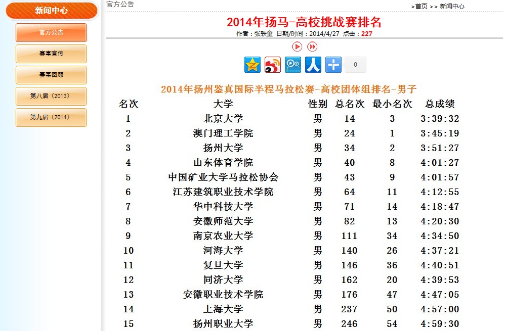 本网讯(437ccm必赢国际版)近日,“中国海运杯”2014扬州鉴真国际半程马拉松赛暨全国半程马拉松锦标赛组委会发布了高校挑战赛成绩公告,我校代表队荣获女子团体第四名、男子团体第八名的好成绩。