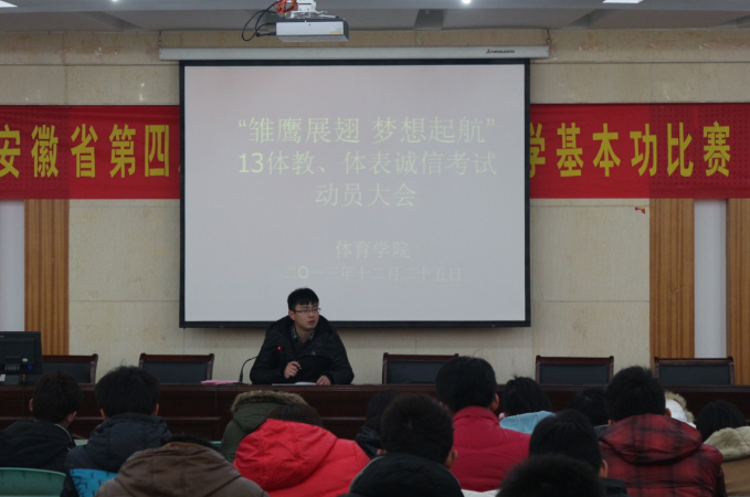 本网讯(新闻中心 严伟)为迎接2013-2014年度第一学期期末考试,确保考试工作顺利进行,12月25日中午,2013级体育教育、体育表演专业在学院圆形报告厅开展了以“雏鹰展翅,梦想起航”为主题的诚信考试动员大会。2013级体教、体表全体同学参加会议。会议由辅导员朱凯迪主持。