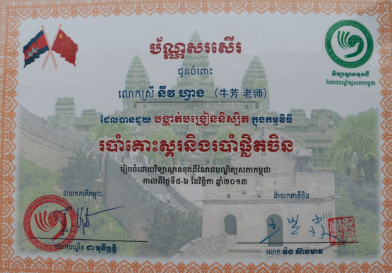 在为期一周的教学示范中,牛芳老师放弃休息与交流访问的机会,全身心的投入到教学工作中。她就秧歌舞的文化背景、各项技术要点和重要环节等都做了详细讲授。经过培训教学,牛芳老师不仅帮助学员初步学会了秧歌舞的基本要领,同时也为中国传统文化艺术的传播,中柬友谊的增进贡献了自己的力量。如期完成教学任务后,牛芳老师的教学成果得到主办方的一致好评,从而也为学校争得了荣誉。