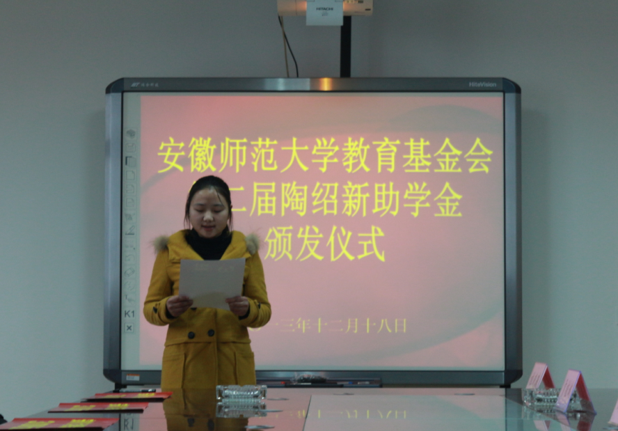 仪式开始由谷开宝老师宣读《关于向许晓东等25名同学颁发第二届陶绍新助学金的决定》。在大家热烈的掌声下,陶绍新董事长向今年受助的25名同学颁发助学金并激励大家好好学习,抱着感恩的心日后来回报母校。随后院长雷震在致辞中首先表达了对陶绍新董事长的欢迎与感谢,他向大家回顾了2012年首批受助28名学生受助后的学习生活情况,他们不仅在学习上取得了更加优异成绩,在其他各方面表现也一样出类拔萃。院长对本次受助学生寄予了厚望,希望同学们能合理使用助学金,要发扬自强不息,勇于奉献的精神,向陶绍新董事长学习,将感恩之情薪火相传。来自2010级体育教育专业的何静同学作为学生代表在向陶绍新董事长表达他们感谢的同时也表示在日后学习生活中一定会用自己的成绩来回报学校和社会的关爱。