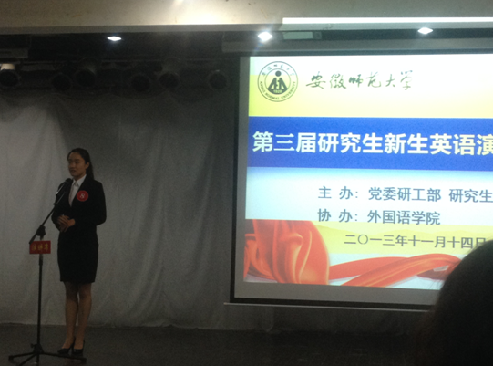 通过选拔,我院2013级研究生段雨晴同学代表437ccm必赢国际版参加了本次比赛。经过三轮近3个小时的激情比赛,段雨晴同学用形式新颖的开场白,镇定自若的语调以及标准的英音沉着应战,最终以表达流畅、视角独特、思路清晰的演讲,取得了二等奖的可喜佳绩,为我院争得了荣誉。