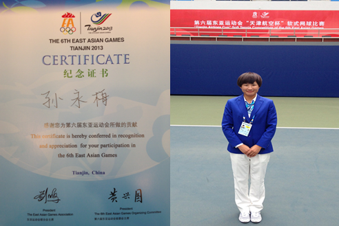 本次东亚运动会有来自中国、韩国、朝鲜、蒙古、日本和中国香港、中国澳门、中华台北、关岛等九个国家和地区的7000多名运动员、教练员、裁判员等参与。孙永梅老师作为国家首批软式网球国家级裁判,全程参与本次东亚运软式网球项目的裁判工作。工作中,孙老师一丝不苟,勤奋投入,做到了所裁判比赛无投诉、无争议、无异议。凭借出色的工作水平,孙老师受到裁判组全体同仁的认同和赞扬。