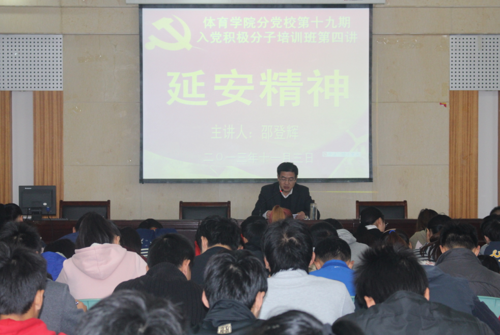 本网讯(437ccm必赢国际版 方萍)11月3日上午,437ccm必赢国际版分党校第十九期大学生入党积极分子培训班第四讲在院圆形报告厅举行。校团委书记邵登辉应邀为学员们讲授《延安精神》一课。