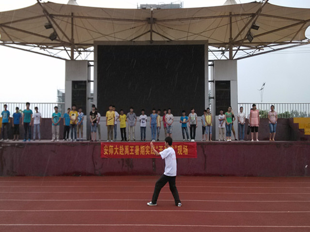 (通讯员 蔡萌萌)7月8日上午8:00,安师大赴怀远阳光体育团队在禹王中学操场开始了第二天的教学活动。志愿者张迪、李昌源带领高一(7)班同学开展太极拳教学。