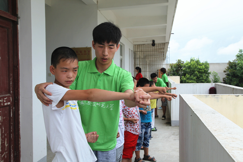 启动仪式过后,小分队来到了峨桥镇岳山村村委会活动中心,组织起“爱心家书”和“亲情电话”的活动,队员们向峨桥镇的留守儿童发起倡议,鼓励、指导他们拿起手中的笔,给父母写一封信,可以向父母汇报自己的学习情况,也可以倾诉自己对爸爸妈妈的思念以及留守岁月中的点点滴滴。或是利用村委会提供的免费电话,给远在外地的父母打去一通电话,利用声波进行亲情的沟通。最后,队员们统一为“爱心家书”活动中的二十余封家书提供了信封和邮票,孩子们郑重地在信封上写好地址将信寄出。此次活动建立了一座沟通留守儿童与父母的桥梁,拉近了他们之间的距离,给孩子们提供了一个很好的情感表达的机会。下午,团队开展了一系列的丰富多彩的活动内容,教孩子们写毛笔字、跳现代舞、打五步拳等。通过这些活动,调动孩子们对体育锻炼的积极性,丰富他们的课余生活,并让其综合素质得到培养和锻炼。