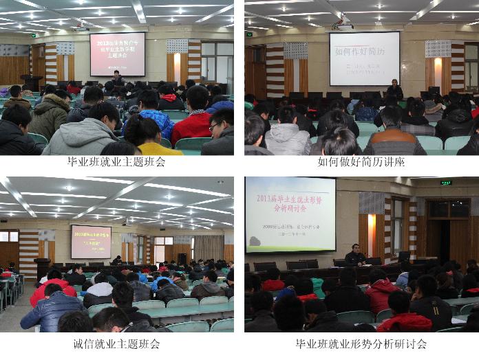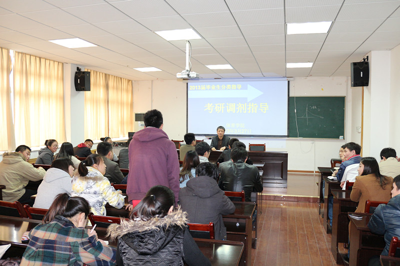 分类指导,毕业生就业服务有措施 为给毕业生提供更为深入、实际的指导,学院积极采取措施,加强就业指导服务工作。从毕业班一开始就组织开展了“就业形势分析研讨会”、“如何做好简历”、对学生实行全程化的就业教育,帮助毕业生解决思想困惑,树立正确的择业观和就业观。同时,针对本院毕业生四个主要出口:研究生、教师、公务员和自主创业,学院组织了分类系列指导:“考研复试培训”、“考研调剂指导”、“无生上课技巧”、“2013年考公政策解读”、“创业有风险,投资需谨慎”等专题指导。种种分类指导培训与交流对提高毕业生就业能力,增加就业砝码起到了积极作用。