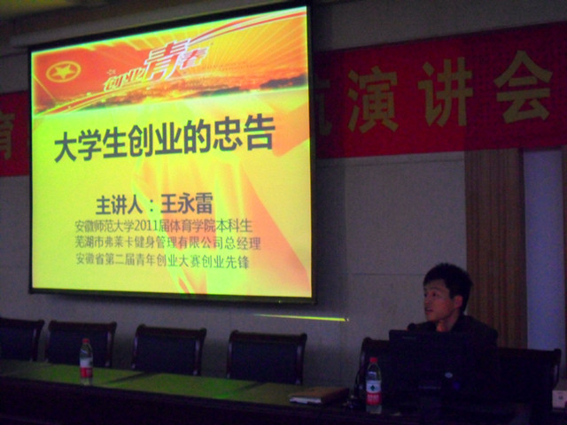 王永雷,437ccm必赢国际版2011届优秀毕业生,芜湖市创业之星,创办了bwin必赢线路检测星洲创业培训学校。王永雷以他创业成功道路上的经验为同学们总结出了八点忠告:一是一切面向市场,从我能做什么或我有什么资源为出发点;二是选好你的团队;三是控制你的成本;四是想到就去做;五是随时准备转向;六是赚钱才是硬道理;七是懂一点财税常识;八是交一个好的创业导师。