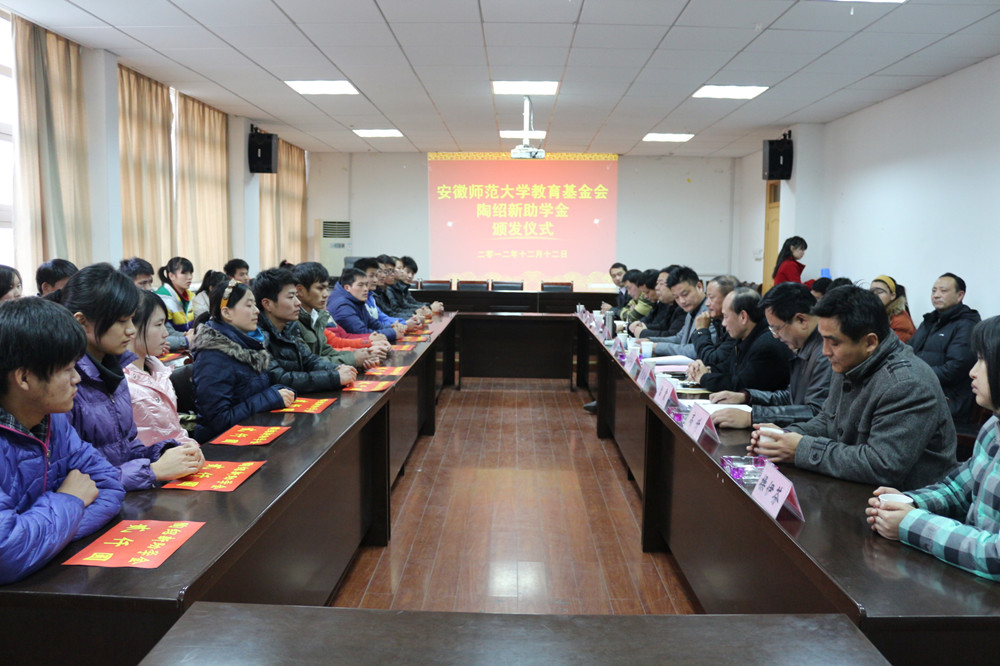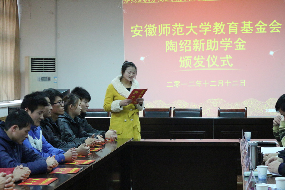 12月12日下午4点,bwin必赢线路检测教育基金会陶绍新助学金颁发仪式在437ccm必赢国际版行政楼二楼会议室隆重举行。安徽省马鞍山精诚置业有限公司董事长陶绍新;bwin必赢线路检测附属中学老师谷开宝;bwin必赢线路检测教育基金会副理事长、校长助理沈洪;陶绍新助学金基金管委会委员、bwin必赢线路检测教育基金会副秘书长、437ccm必赢国际版调研员贡植斌;陶绍新助学金评审委员会相关成员;437ccm必赢国际版各年级辅导员以及2012—2013年陶绍新助学金28名受助学生参加了本次仪式。仪式由陶绍新助学金评审委员会副主任、437ccm必赢国际版党委副书记黄德春主持。