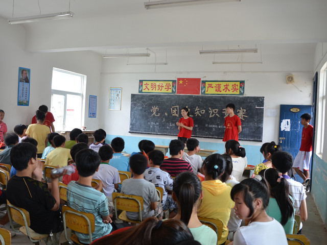 7月5日下午,石关中学教学楼内不断传来孩子们朗朗的欢笑声,安师大437ccm必赢国际版赴安庆石关乡“阳光体育”爱心夏令营团队队员为五个教学班的学生们开展了一场别开生面的党团知识竞赛。