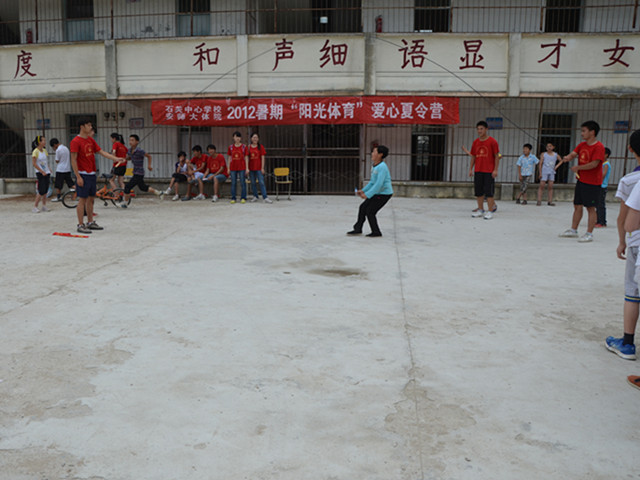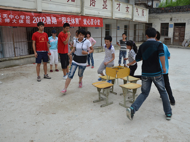 经过团队队员的精心策划和筛选,最终选定了包括集结飞绳、抢板凳、蜈蚣赛跑在内的多个游戏项目寓教于娱,在游戏过程中锻炼孩子们的团队协作精神和公平竞赛精神。在游戏里,年龄最大的同学已初三毕业,最小还是一年级学生,但是他们快乐的笑声已经告诉我们,年龄已经不是他们快乐的障碍,就连参加实践的队员们都融入到孩子们的快乐中,体味阳光温暖,体味运动的快乐。