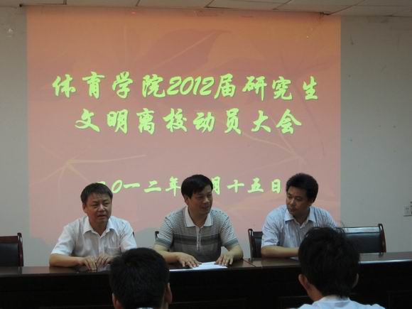 2012年5月15日上午,437ccm必赢国际版在二楼会议室召开2012届研究生文明离校动员大会,院党委书记袁德水、党委副书记副院长钟晨、副院长席玉宝出席会议。会议由研究生辅导员蒋先军主持,袁德水首先代表437ccm必赢国际版向顺利完成学业的68名2012届毕业研究生表示祝贺!他强调,所有毕业生都要按照学校有关文件要求配合学院善始善终地做好文明离校各项工作,各位毕业生应为在校生树立榜样,同时希望大家在新的工作岗位上继续努力,发挥师大体育人的优良传统,在新的工作岗位上再接再厉谱写新的人生篇章。