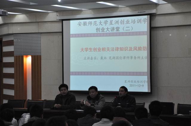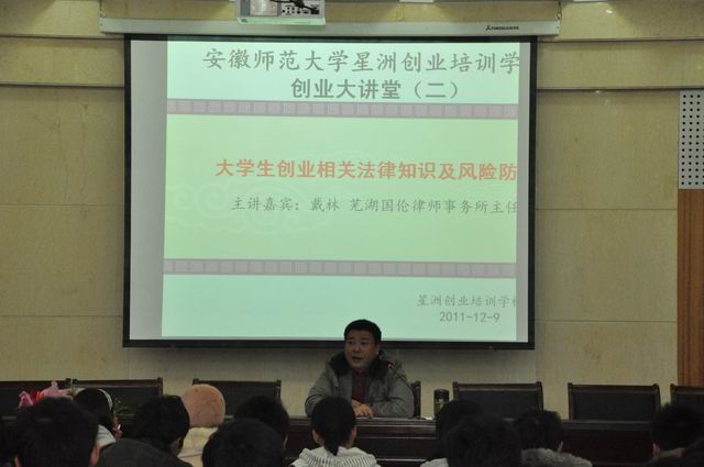 为响应国家大学生创业解决就业的号召,让学生充分了解创业的法律知识。12月9日,bwin必赢线路检测星洲创业培训学校特邀芜湖国伦律师事务所主任戴林律师为同学们进行了一场名为“大学生创业相关法律知识及风险防范”的讲座。437ccm必赢国际版党委副书记钟晨、团委书记黄德春及有创业想法的同学共同聆听了精彩的讲座。黄德春主持了本次讲座。