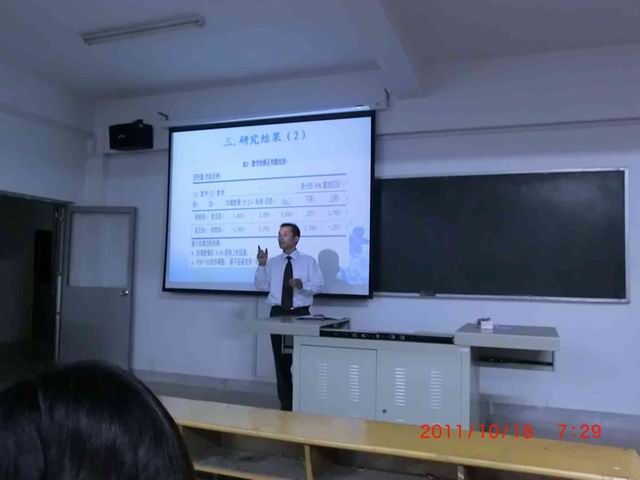 本次报告主要围绕“引言、实验方法、研究结果、分析与讨论、结论与建议”几点展开。在吴老师铿锵有力、掷地有声的报告声中,让我们体会到学术报告的严谨与神圣,了解到传统学习与自主学习的区别,认知到统计方法在科研中的重要性,更懂得“会学”比“学会”更重要。报告完毕,吴老师还鼓励大家积极提问交流。这次学术报告不仅开阔了我们的视野,扩宽了我们的知识,也引导了我们的学习,激发了我们的兴趣,激励着我院2011级研究生们在学术道路上奋勇前行!