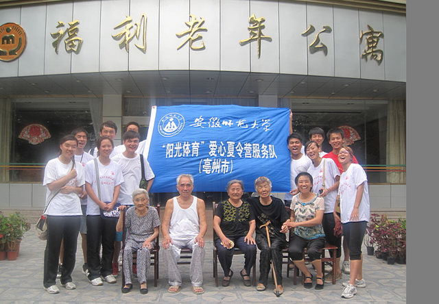 15日下午,安师大学437ccm必赢国际版赴亳州市建安中学“阳光体育”爱心夏令营团队志愿者给亳州市敬老院带去了真挚的慰问,志愿者与老人们手拉手的讲话,心贴心的交流。一位老奶奶紧紧握住志愿者的手说:“你们以后一定还要来看看我们呀!”志愿者一只手紧握老奶奶的手,另一只手悄悄抹去眼角的泪水。