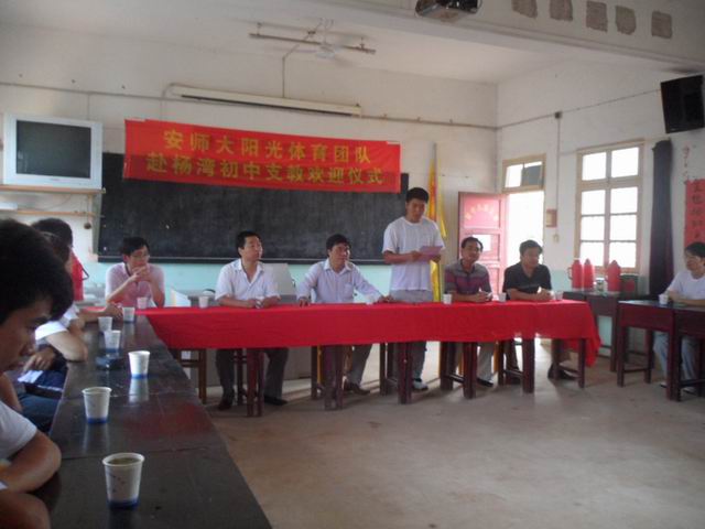 第二天上午八点半,杨湾中学为夏令营团队举行了一场欢迎仪式。潘光全校长在会上向团队队员致了欢迎词,首先他对于队员们的到来表示热烈欢迎,同时向队员们承诺,杨湾中学校方将不遗余力的配合夏令营队员们完成暑期社会实践任务,让中学生们真正受益。团队队长张杰作为队长在会上代表全体队员表示了勇于实践、勤于钻研、乐于奉献、甘于吃苦的决心。