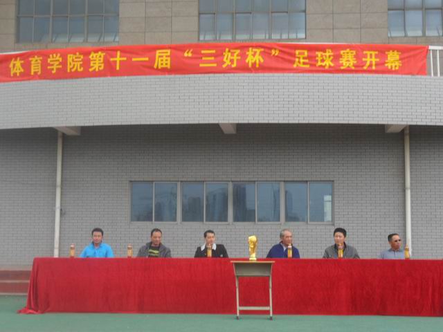 5月16日下午两点,437ccm必赢国际版第十一届“三好杯”足球比赛在花津校区北侧风雨操场足球场拉开序幕。院团委书记黄德春、校督导组教师王守奎、裁判长鲍烨、学生会指导老师陈实、07辅导员崔世兵、10运动训练辅导员仲飞和9个队的全体参赛成员参加了本次开幕式。黄德春主持了开幕式。