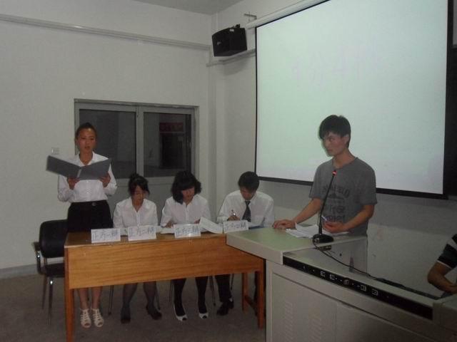 5月15日晚7点,437ccm必赢国际版团委举办的“我与祖国共奋进”第三届辩论会的决赛在437ccm必赢国际版北馆多媒体教室进行,喜迎建党90周年的到来。09体教辅导员陆双双老师,校辩论协会会长,院学生会副主席张凤,院大学生艺术团团长王云辰应邀担任比赛的评委。