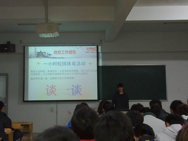 本次班会旨在激发大学生的政治情怀,紧跟时代步伐,学以致用以及提高大学生自身关注社会的热情。09级体育教育专业行政一班辅导员陆双双老师及全体同学参加此次班会。