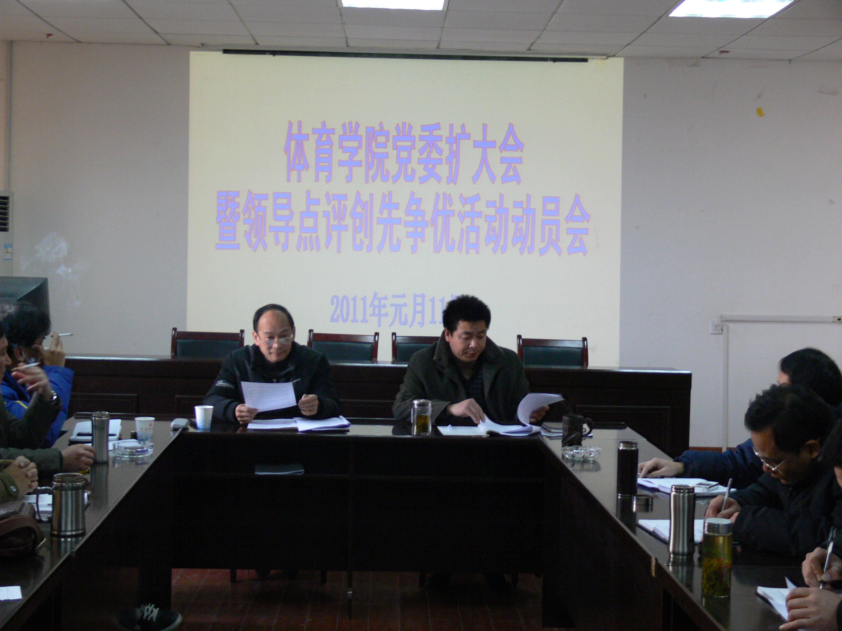 2011年1月11下午,437ccm必赢国际版党委召开党委扩大会议暨领导点评创先争优工作动员大会,学院党委委员和所属党支部书记出席大会。党委书记贡植斌详细解读了校创先办(2011)1号文件和学校党委副书记、校长王伦在学校领导点评创先争优工作会议上的讲话精神,研究部署437ccm必赢国际版领导点评创先争优工作安排,并对学院领导点评创先争优活动提出了具体要求。目前,437ccm必赢国际版领导点评创先争优工作正在按部署有序进行。1月20日前将完成领导点评创先争优工作。