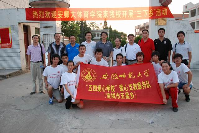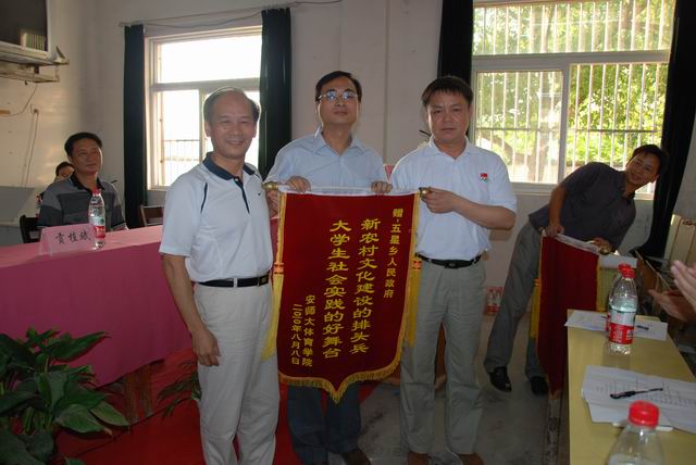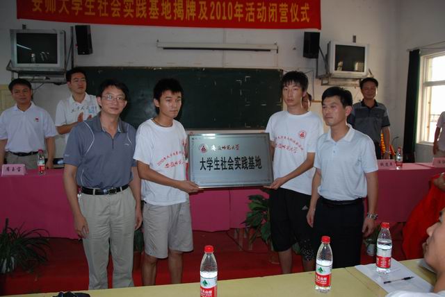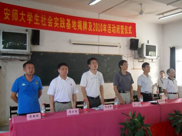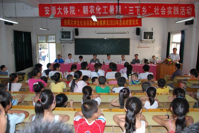8月9日下午,在宣城市五星乡中心小学礼堂隆重举行了安师大暑期社会实践活动基地揭牌暨2010年暑期社会实践活动闭营仪式。出席仪式的有校长王伦、校团委副书记邵登辉、437ccm必赢国际版党委书记贡植斌、副院长席玉宝、院团委书记黄德春、团队指导教师崔世兵、陆双双、宣州区副区长陶晓海、区教育局党委副书记钱逢年、朝农公司董事长黄朝斌、五星乡的党政领导,以及437ccm必赢国际版“五四爱心学校”大学生志愿团的师生代表。仪式由五星乡党委书记汪征跃主持。