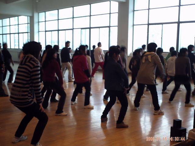 本周天公不做美,雷声隆隆、大雨倾盆,令人振奋的是:有来自各学院的近百名同学冒着大雨参加,大雨没有削弱他们对街舞的热情,仍然伴着动感的音乐,激情舞动青春,场面之大,令人意外。同学们几乎都是初次接触街舞,没有什么基础,杨潇同学便从最基本的教起,耐心的指导,纠正不正确的动作,同学们认真的学习,体育馆像是一片舞动的海洋!